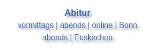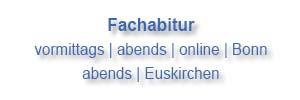 Sie wollen gebührenfrei Ihren Wunschabschluss bei uns nachholen – Ihren Ersten Schulabschluss, Ihren Erweiterten Ersten Schulabschluss, Ihren Mittleren Schulabschluss, Ihr Fachabitur oder Ihr Abitur? Diese Abschlüsse bieten wir vormittags und abends in Bonn oder Euskirchen für Sie an!