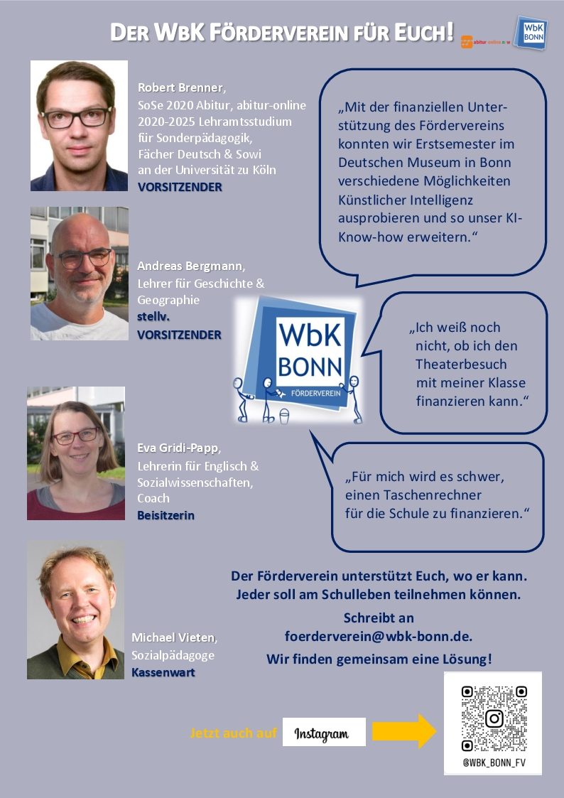 Seit 1974 gibt es den Verein der Freunde und Förderer des Weiterbildungskollegs der Stadt Bonn e. V. Als Förderverein verfolgt er ausschließlich und unmittelbar gemeinnützige Zwecke und hat sich zum zentralen Ziel gesetzt, sein Möglichstes zu tun, damit persönlich-finanzielle Schwierigkeiten nicht dazu führen, dass Studierende an schulischen Veranstaltungen nicht teilnehmen können oder die Schule ohne einen höheren Schulabschluss verlassen müssen. Der Förderverein hilft schnell, unbürokratisch und diskret. In den letzten Jahren wurden z. B. die Anschaffung von Videokonferenzsystemen in der Corona-Pandemie, Materialien für verschiedene Projekte, Lesungen, WbK-Büchertaschen für die Erstsemester oder kleine Präsente für die Gewinner des Stadtradelns gefördert. Besonders erfolgreiche AbiturientInnen erhalten traditionell Buchprämien. Der Förderverein versteht sich als Bindeglied zwischen den Studierenden, den ehemaligen Studierenden und dem Kollegium. Jede/r, die/der das Schulleben über den Förderverein mitgestalten möchte, ist herzlich willkommen.